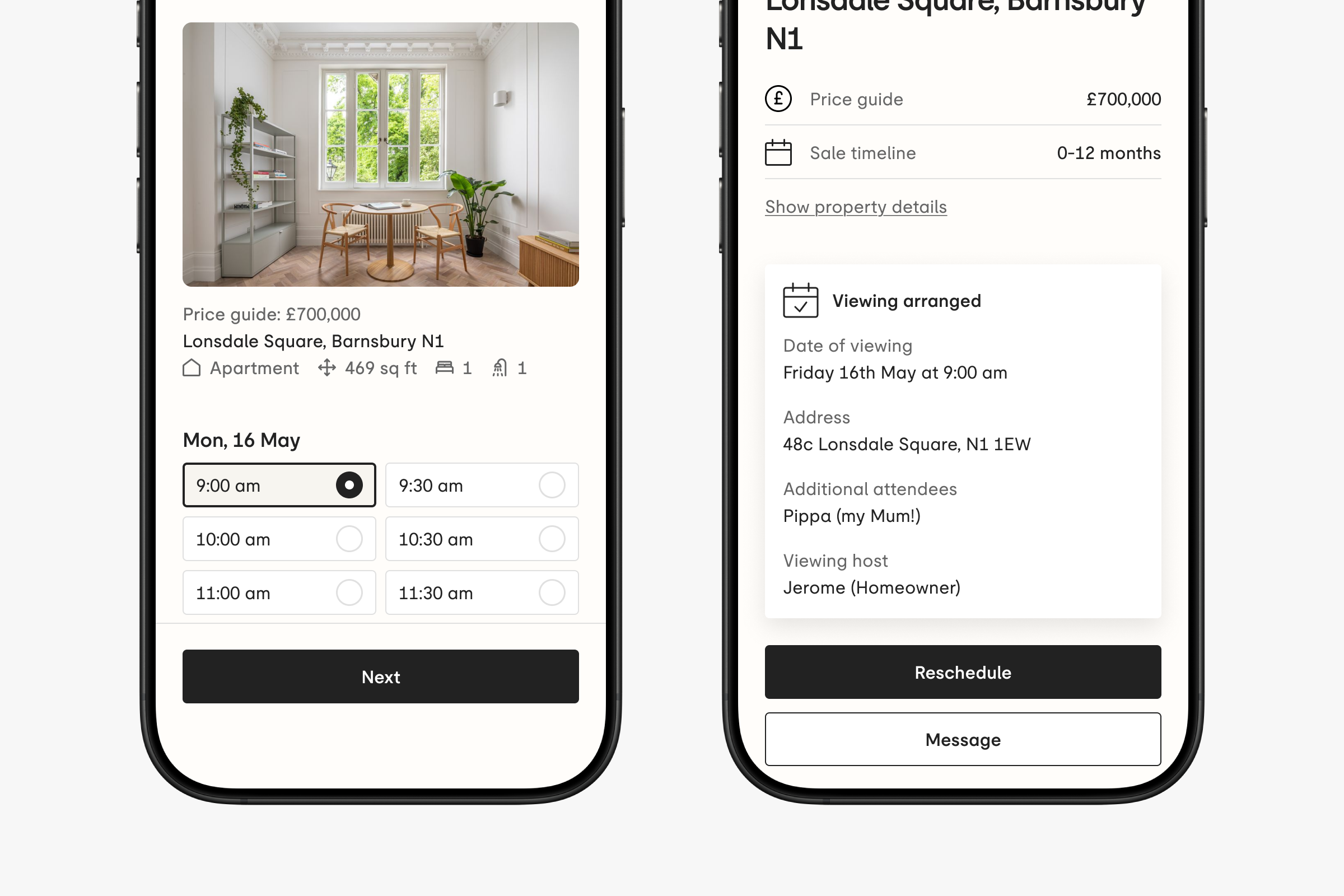 You'll be prompted to choose a time from the viewing availability the homeowner has shared. Once everything is booked, you’ll receive a confirmation email with all the details, including the full address.