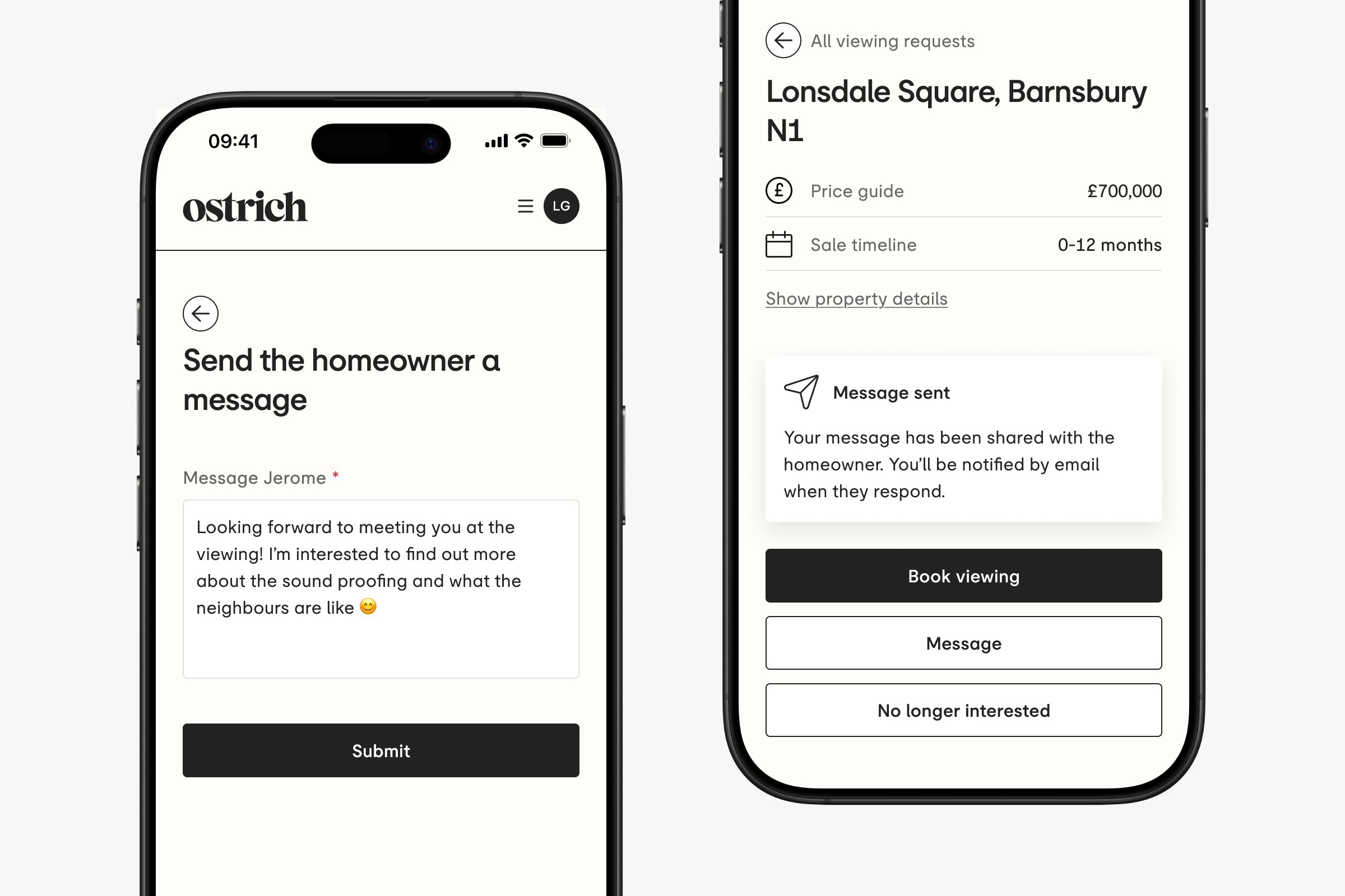 With Ostrich, you can manage all communication with the homeowner through your account. You can send and receive messages, request and schedule viewings, share feedback, and make formal offers - all in one place.
